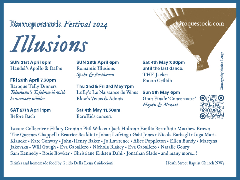 Under the title of Illusions, the ever-enterprising Baroquestock presented their Baroquestock Festival 2024 at their accommodating home base of Heath Street Baptist Church in Hampstead. The festival included 8 events spread over two weeks, one of the highlights being two semi-staged performances of Lully’s and Blow’s takes on the story of Venus. A fascinating pairing that covered the birth of Venus and Blow’s French-inspired version of the later story of Venus and Adonis.